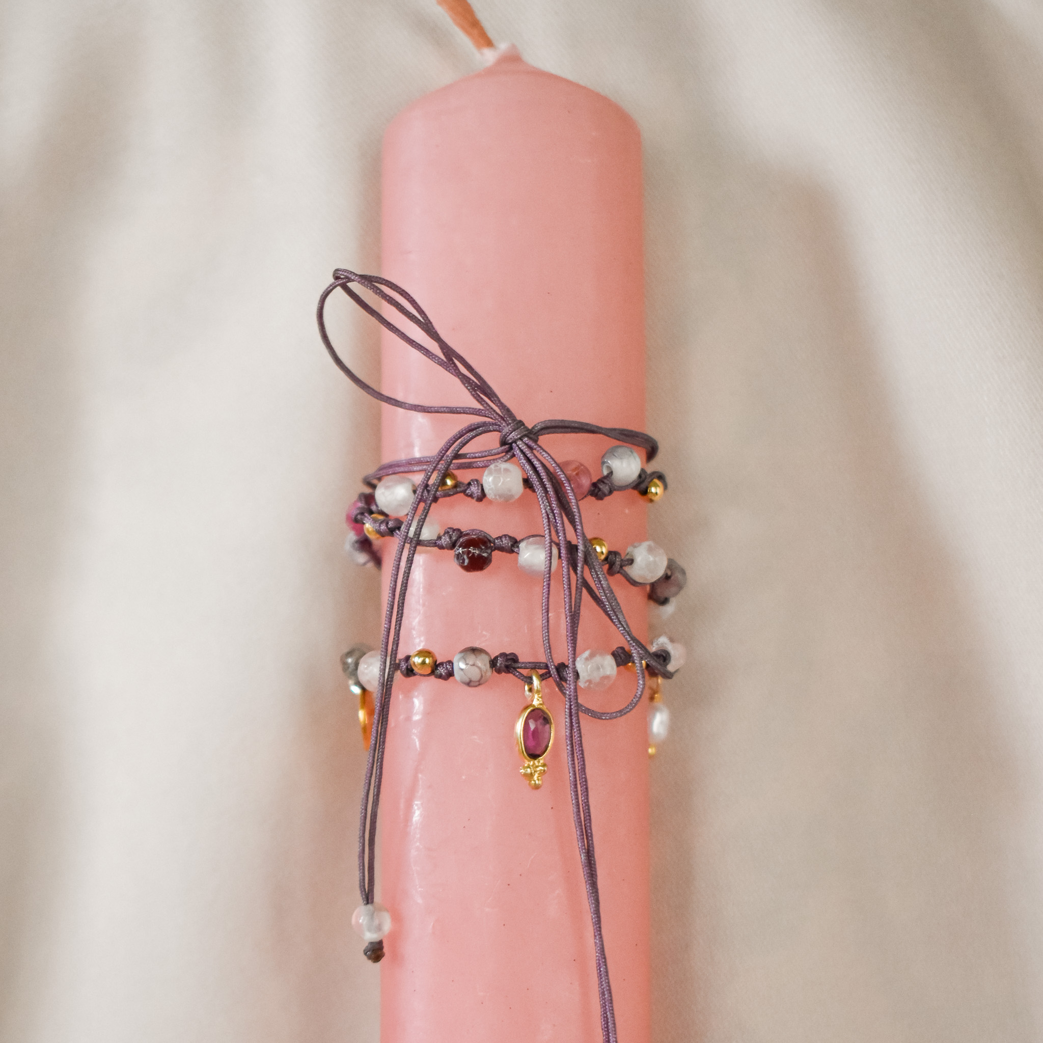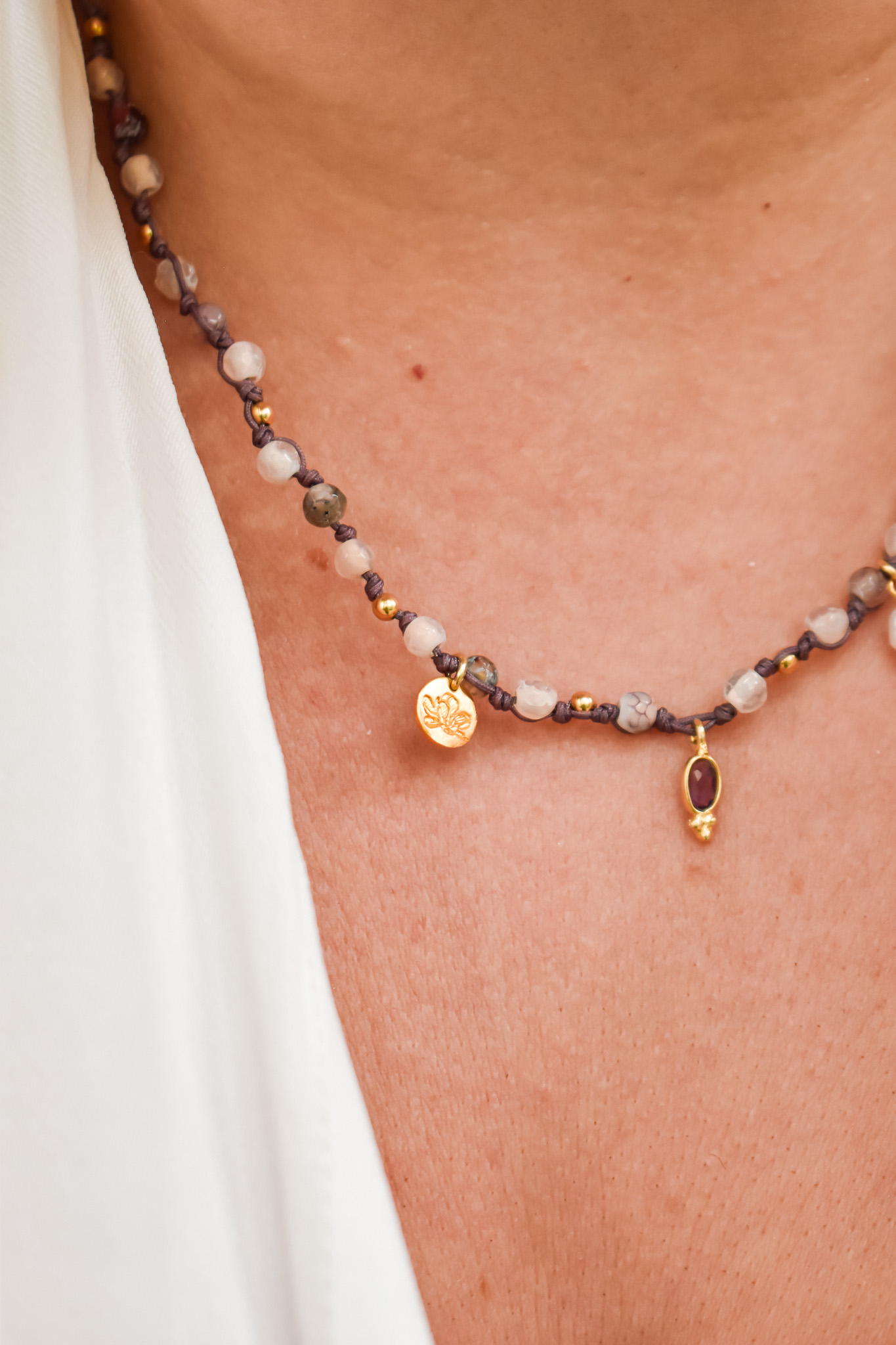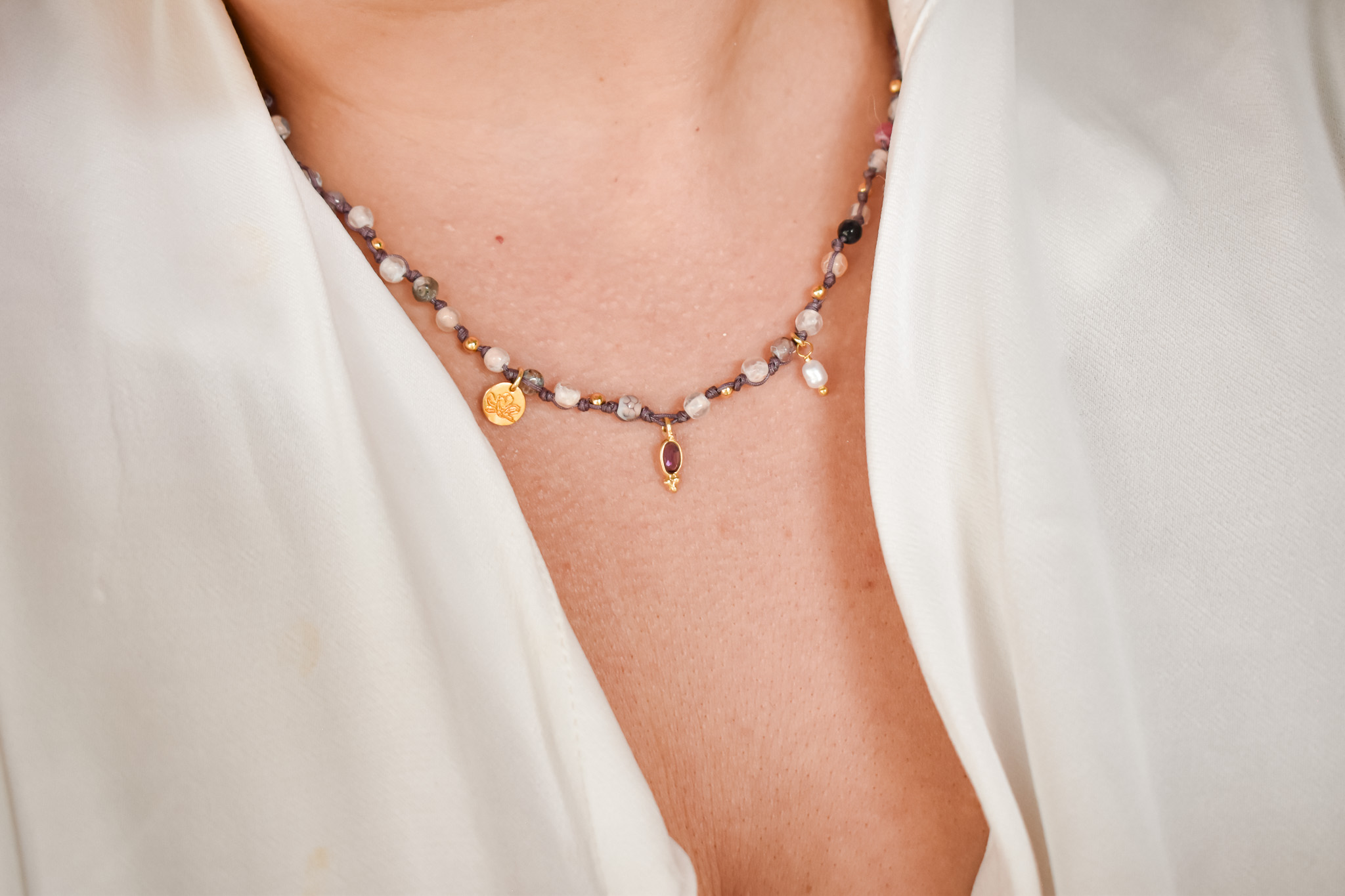 Ο στολισμός γίνεται από ένα εξαιρετικό κόσμημα από επίχρυσο ασημί 9.25, με αυξομειούμενο μήκος, το οποίο μπορεί να φορεθεί ως κολιέ ή τριπλό βραχιόλι. Το κολιέ αποτελέιται απο χάντρες αχάτη σε διάφορες παλ αποχρώσεις, δεμένες κόμπο-κόμπο και διαθέτει έναν κεντρικό λίθο αμέθυστο. Το κρεμαστό μαργαριτάρι και το Λουλούδι Μανόλια ολοκληρώνουν το κολιέ, ενισχύοντας την αίσθηση της αρμονίας και της φυσικότητας.