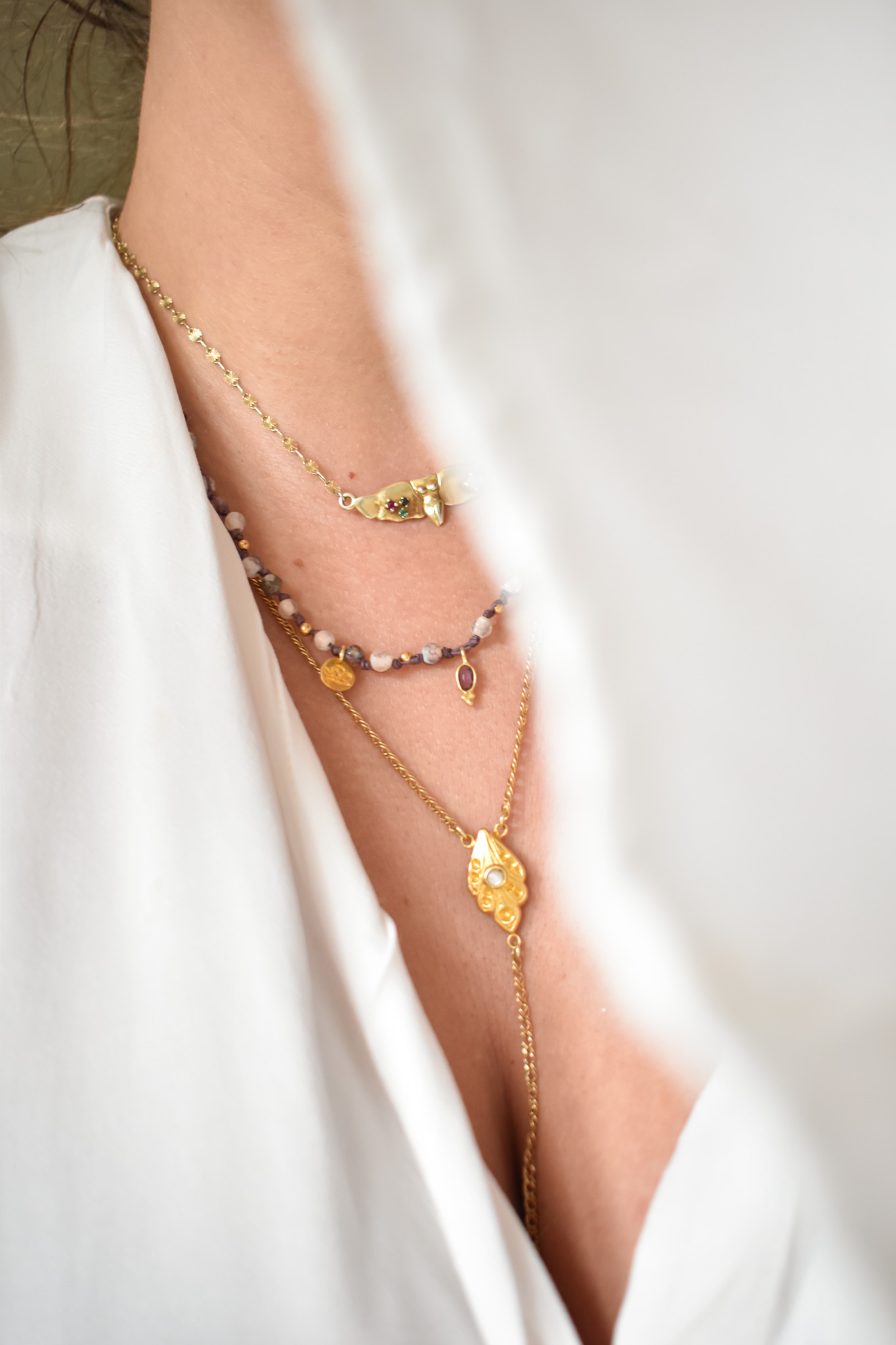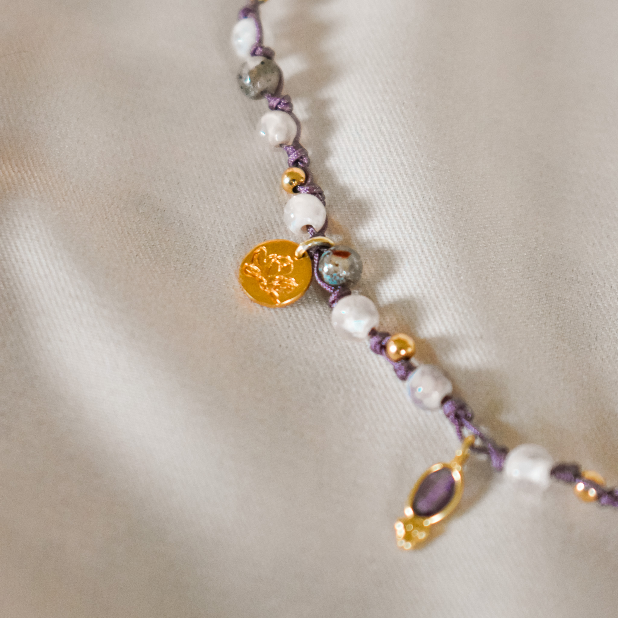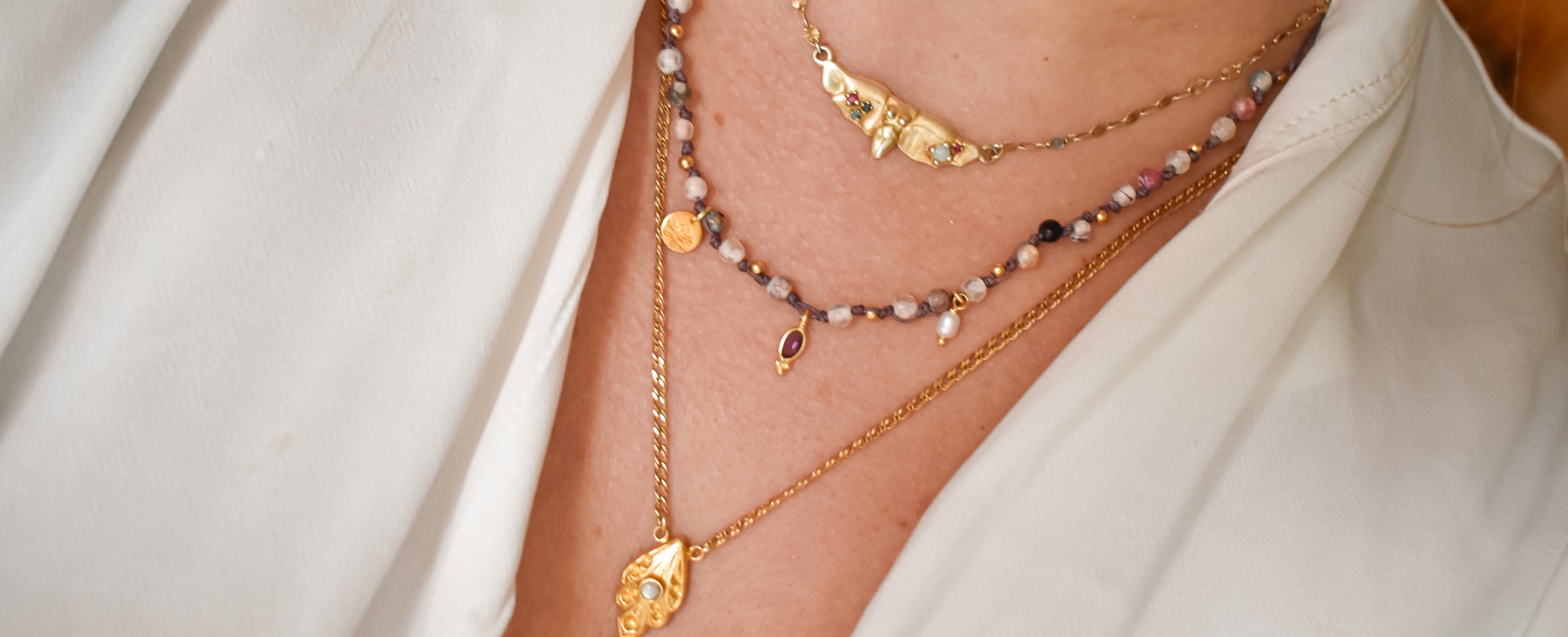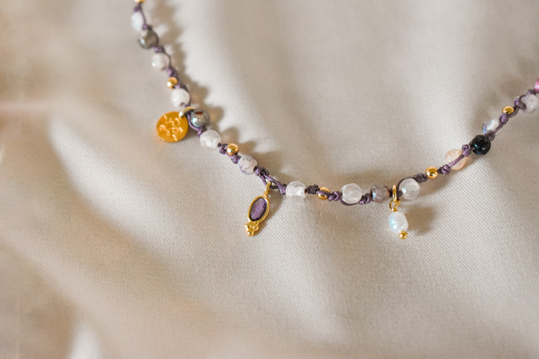Ο στολισμός γίνεται από ένα εξαιρετικό κόσμημα από επίχρυσο ασημί 9.25, με αυξομειούμενο μήκος, το οποίο μπορεί να φορεθεί ως κολιέ ή τριπλό βραχιόλι. Το κολιέ αποτελέιται απο χάντρες αχάτη σε διάφορες παλ αποχρώσεις, δεμένες κόμπο-κόμπο και διαθέτει έναν κεντρικό λίθο αμέθυστο. Το κρεμαστό μαργαριτάρι και το Λουλούδι Μανόλια ολοκληρώνουν το κολιέ, ενισχύοντας την αίσθηση της αρμονίας και της φυσικότητας.